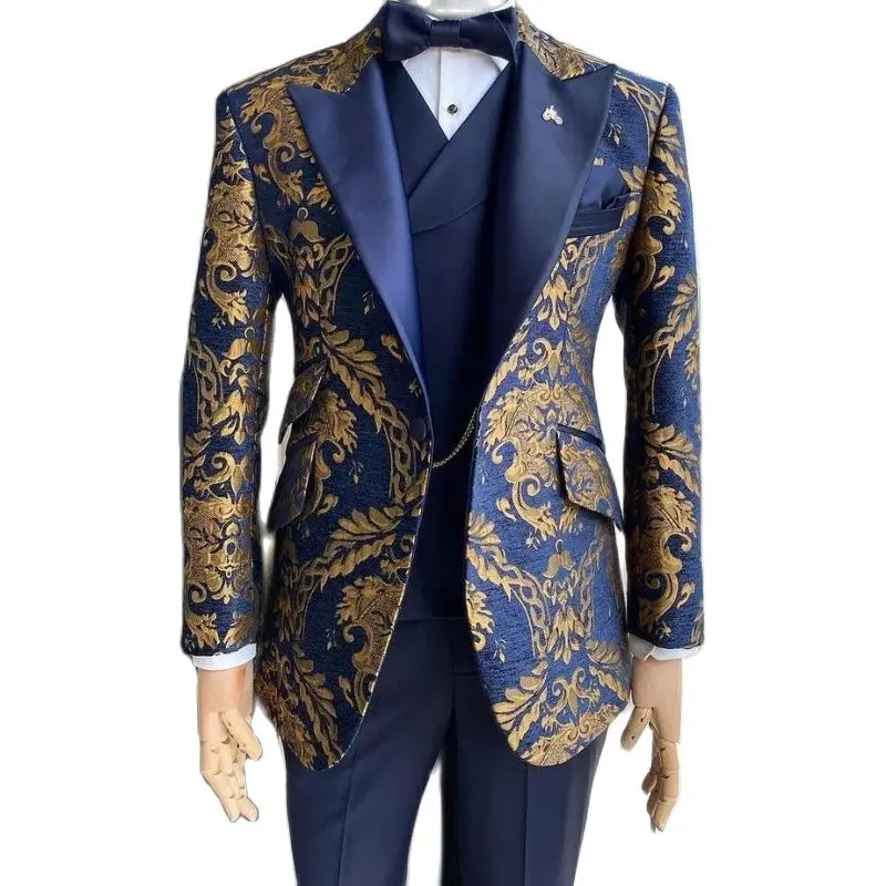 Floral Jacquard  Suits for Men Wedding Slim Fit Navy Blue and Gold Gentleman Jacket with Vest Pant 3 Piece Male Costume